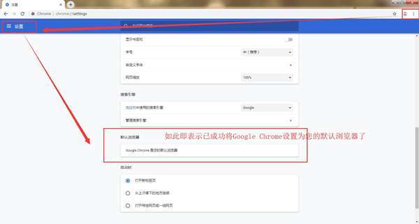 3、将谷歌浏览器设置为默认浏览器,点击浏览器右上角的三个横线标志,再点击左边菜单栏的【设置】,最后点击【将Google chrome 浏览器设置为默认浏览器】
