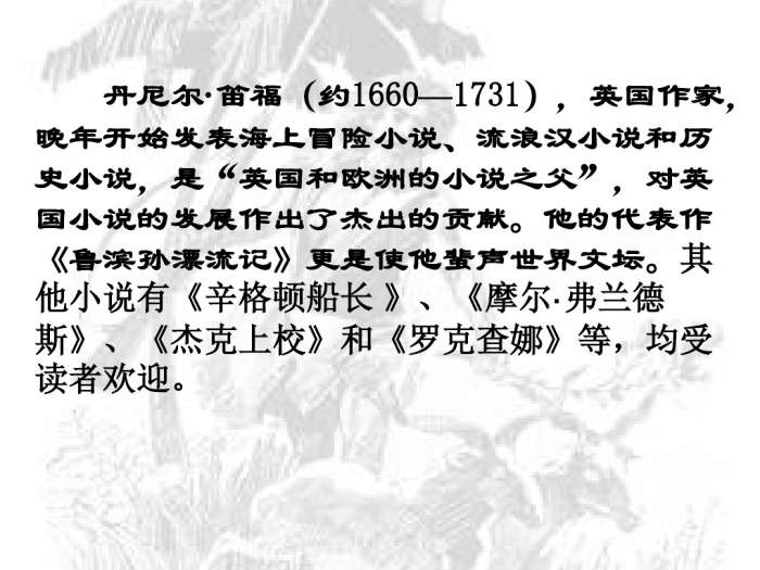 丹尼尔·笛福(1660—1731)——在18世纪英国四大著名小说家中,笛福名列第一(其余三个分别是乔纳森·斯威夫特、塞缪尔·理查逊和亨利·菲尔丁),被誉为“英国与欧洲小说之父”。 笛福生于伦敦一个油烛商家庭,年轻的时候,是一个成功的商人。在从事商业的同时,他还从事政治活动,代表当时日益上升的资产阶级出版了大量的政治性小册子,并因此被捕。笛福直到晚年才开始创作小说。写《鲁滨逊漂流记》时,他已59岁了。此后,他又创作了《辛格顿船长》《杰克上校》《摩尔·弗兰德斯》等小说,这些小说对英国及欧洲小说的发展都起了巨大的影响以及作用。