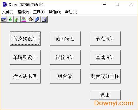 主界面只是一个引导平台,作为各模块的整合,并非执行文件。但必须通过此平台方能进入到各模块。包括截面特性、简支梁、拼接节点 、锚栓、基础设计、单跨梁、组合梁、钢管混凝土柱、双向插入法求值。关闭时主界面时程序全部关闭。。。