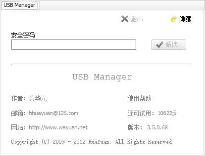 usb manager免费版 v3.5.0.68 绿色版usbmanager免费版是一款可以帮助你防止u盘恶意拷贝电脑里面的资料,保护电脑不被恶意文件侵害。软件使用简单方便,解压之后就可以使用。需要修改的话只需要将系统时间调到很早就可以了。快来当易网下载吧! 简介:usbmanageru盘防护监控软件,可以阻止未经授