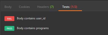 本质上是javascript code,可以为tests object设置values。这里使用描述性文字作为key,检验body中的各种情况,当然你可以创建任意多的key,这取决于你需要测试多少点。 tests也会随着request保存到collection中。api测试保证前端后台都能正常的于api协作工作,而不用在出错时猜测是哪里的问题。 需要在request的test中创建了test后,再进行request,test的结果在body的test中查看。 注意: 1.这里的key描述必须是唯一的,否则相同描述只会执行第一个。 2.这里的key可以使用中文。 例子: tests[“body contains user_id”] = responsebody.has(“user_id”)这里描述性的key为:body contains user_id。检测点为:responsebody.has(“user_id”),意思是检测返回的body中是否包含”user_id”这个字段。查看responses中的tests结果:记过显示每个key,也就是我们测试点的具体结果,是否通过。