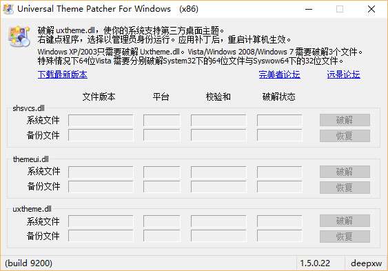通用主题修改补丁使你的系统支持第三方桌面主题。通用补丁,适合所有语言的windows!体积虽小,功能不减,支持自xp以后所有版本的windows,包括32位与64位。