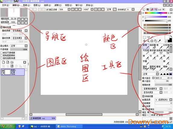 1、打开在本地下载的sai软件,打开软件后,进入软件的界面,您可以看到软件界面可以按照功能分为5个部分:导航区、图层区、绘图区、颜色区、工具区。