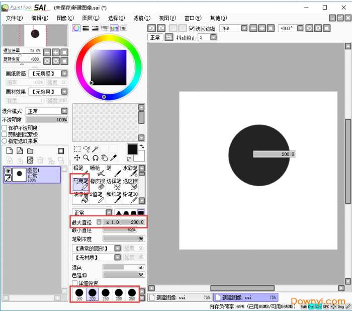 1、打开在本站下载的sai绘画软件,打开软件后点击绘图工具中的【马赛克】将画笔工具最大直径调整为200,或者您可以自行选择。
