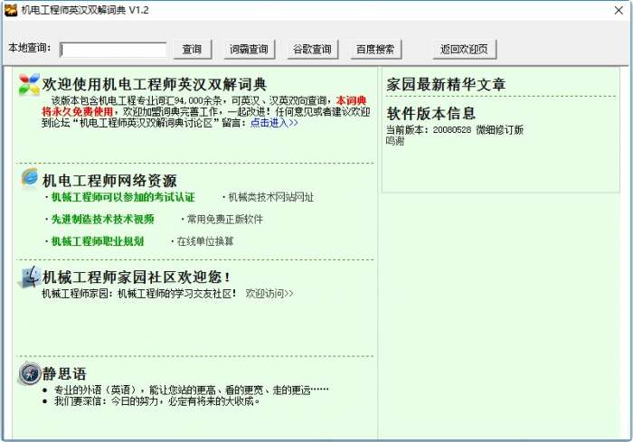 机电工程师英汉双解词典 v1.2 绿色免费版机电工程师英汉词典是一款可以帮助机电工程师们学习和翻译的实用翻译软件,可以进行英汉互译,而且包含了很多专业术语,其中词汇量也很全面,可以查询几乎所有工程方面的词汇,需要的朋友可以来下载试用使用。软件介绍:机电工程师英汉双解词典是一款专门为学习或从