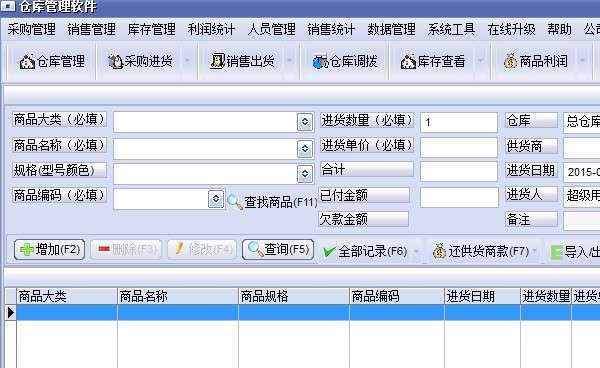 打开进入采购进货界面,依次输入您销售的商品的商品大类,商品名称,商品规格,商品编码,进货数量,进货单价,供货商,进货日期等,然后按增加,即可完成商品的采购进货。
