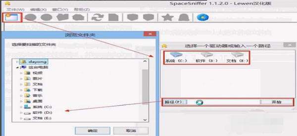 二、打开软件后,点击左上角如下图的位置,然后再选择要分析的盘符或者自己选择路径,即可查找分析改位置磁盘空间的使用情况。