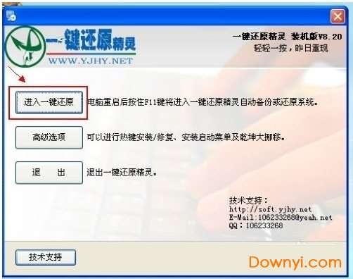2、在打开的窗口中,点击“进入一键还原”,进行系统的备份。