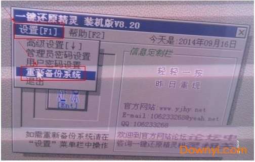 6、在出现这个界面后,点击“设置”,在打开的菜单中,选择“重新备份系统”