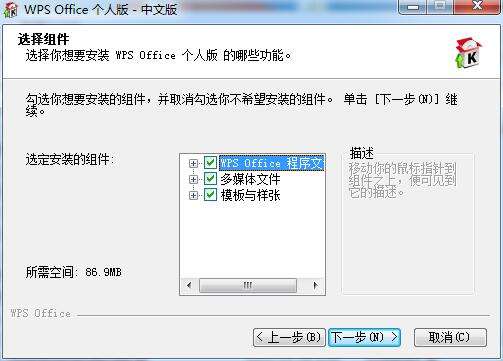 5、选择wps2007安装组件,选定好安装的组件,单击下一步继续
