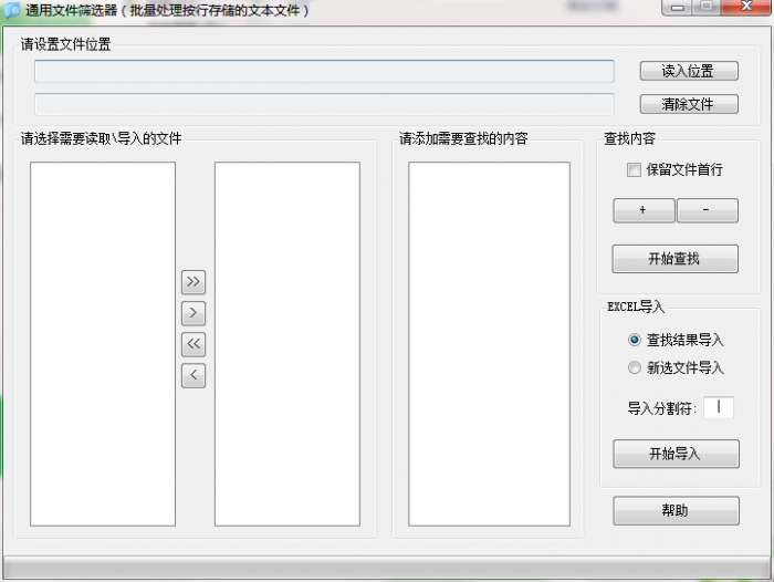 1、批量查找:首先,在“读入位置”按钮处设置你所要读取的文件的存放位置,此时程序会自动读入此文件夹下所有文件,以供选择;其次,用“>>”或“>”将要读取的文件选入读取队列,当然如果选错了可以用“<<”或“<”删除队列,或者鼠标双击选中项删除;再次,点击“+”按钮,添加查找项目到查找项目列表,一次只可以添加一条,如需添加多条则需要重复添加操作;如果添加错误可以双击选中项删除或选中后点击“-”按钮。最后,点击“开始查找”,程序将会把查找结果输出保存到指定路径下面的output文件夹下面,你可以选择是否打开目录查看。如果需要查询的文件有文件头,可以选择“保留文件首行”。