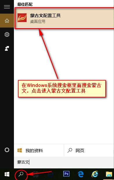 11.安装完成之后,在windos系统搜索框里面搜索蒙古文,会出现蒙古文配置工具,我们点击进入,如图: