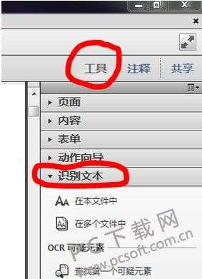 3、在AdobeAcrobatXPro软件工具栏右侧,依次找到工具——识别文本,如下图所示: