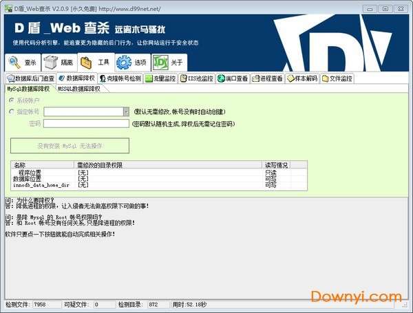 2、特别针对dedecms数据库里的后门数据进行检测,并对使用高权限数据库帐号(如:mysql的root帐号)进行提示,并支持降权操作