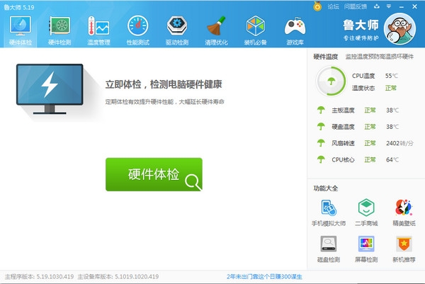 鲁大师电脑版 ,鲁大师2019电脑版拥有专业而易用的硬件检测,不仅超级准确,而且向你提供中文厂商信息,让你的电脑配置一目了然,拒绝奸商蒙蔽。它适合于各种品牌台式机、笔记本电脑、DIY兼容机,实时的关键性部件的监控预警,全面的电脑硬件信息,有效预防硬件故障,让您的电脑免受困扰。