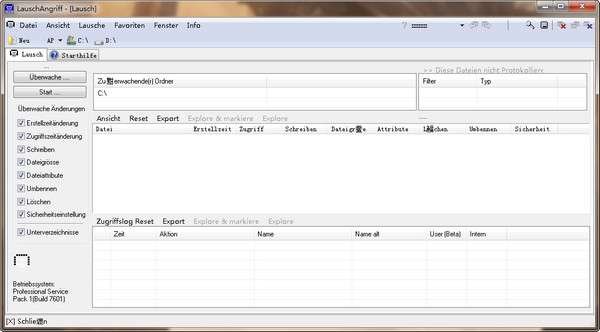 文件和驱动监视软件 ,LauschAngriff免费版是一款小巧好用的文件夹和驱动器监视软件,通过LauschAngriff可以随时监测驱动和文件夹的异常行为,从而判断电脑是否中毒,流量是否被劫持等问题,软件支持检查本地文件夹和网络驱动器的异常举动,通过对磁盘的分析,软件最大的特点就是不要安装,下载即可使用,用完即可删除。