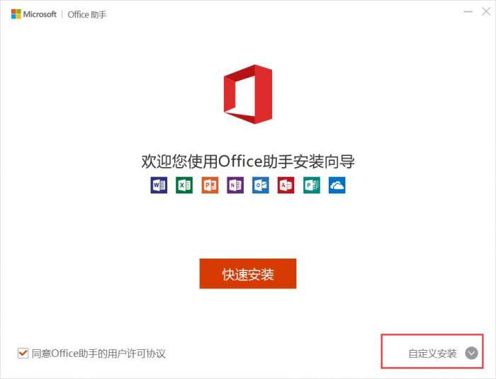 2、双击打开下载的exe文件,进入office2010安装界面,用户可以点击“快速安装”按钮选择默认地址进行安装,也可以点击“自定义安装”自由选择地址进行安装,这里建议选择自定义安装。