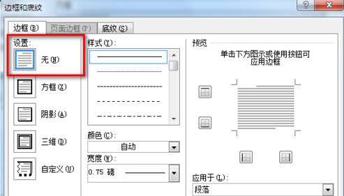4、在打开的边框窗口中,点击设置选项中的【无】,然后点击【确定】。