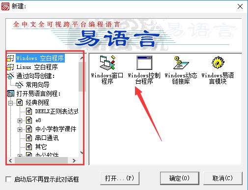 2、在项目新建窗口中,先从左侧选择需要创建的项目类目,之后在右侧选择对应的项目类型,并点击“确定”。(此处我们以“Windows空白程序”中的“Windows窗口程序”为例)