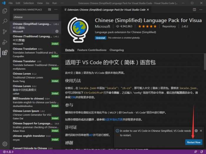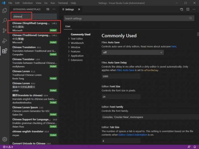 在右侧图示搜索框搜索 Chinese, 在弹出的选项中选择第一个中文简体