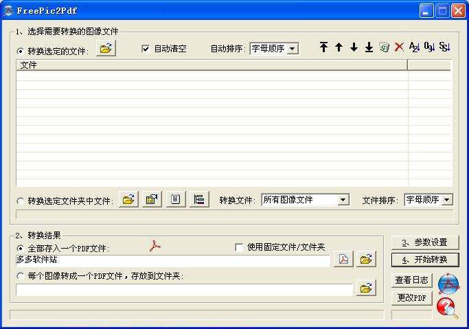可以选择需要转换的文件,也可以指定需要转换的文件夹;可以指定文件排序方式(按字母顺序、按末尾数字顺序、按超星顺序);可以将所有图像文件合并到一个PDF文件,也可以每个图像文件分别转换成一个PDF文件。