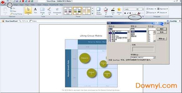 1、设置字体为中文字体即可。SmartDraw的快捷菜单栏是动态的,初学时要注意操作。选中Home选项,先Ctrl+A选中所有图形和文字,然后找到Font,进行中文字体设置