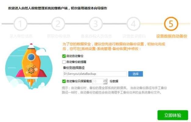 软件安装完成后,点击界面上的【立即体验】按钮(或点击桌面“自然人税收管理系统扣缴客户端”快捷方式),即进入注册流程。注册一共分为五个步骤。