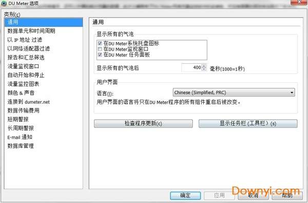 该选项卡下面有四个子界面,首先是“常规”界面,如图三所示,在这个界面,我们能够选择du meter的一些显示方面的选项,值得注意的是,如果你有多块网卡,那么就需要在该界面下面的“要监视的网络设备”下面选择“全部接口”就可以监视你的计算机的所有联网的设备了,当然,你也可以选择单个设备进行监视。另外,一定要确保“和windows一起加载”这个选项一定要勾上,这样才能在你启动系统的时候自动启动du meter,而不需要自己手动开启。