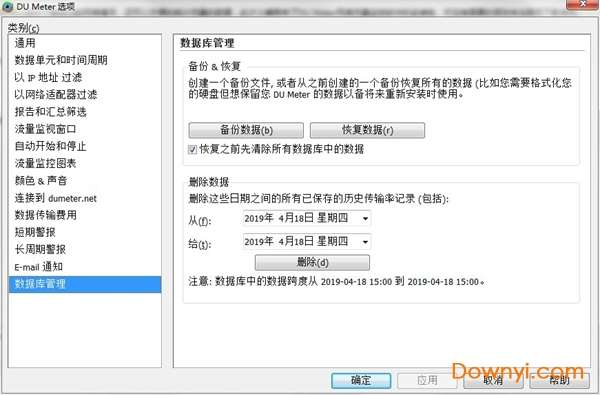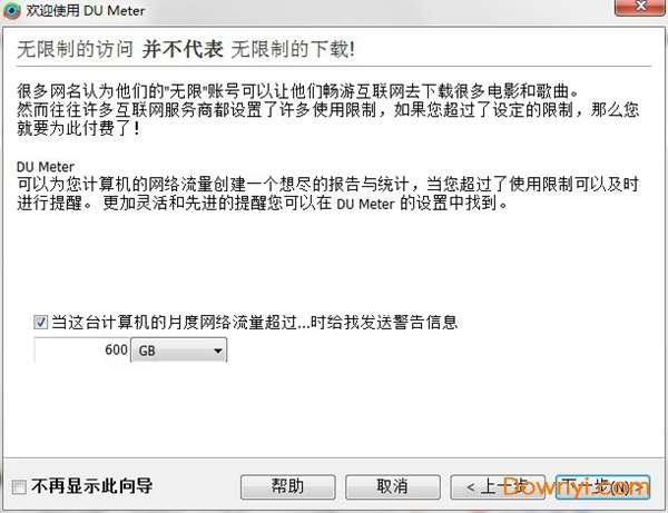 报警和报告”界面,如图五所示,如果你的上网方式是按流量或时间上网的话,那么你就要在这个页面里面好好的设置了。假设你的每个自然月的前8gb的下载流量是包月的,超过8gb的部分就要多收你的银子了,那么你需要做的就是把每月启动的时间设置为“第1天”,报警流量设为“8”“gb(g 字节)”,类型设成“下载”,周期范围设为“月”。这样设置好了之后,当你到了某个月十六号(半个月)的时候,du meter就会自动检测你的这个月下载流量之和是否大于4gb(8gb下载流量的一半),如果大于了4gb,它就会报警。这样是不是很智能呢?