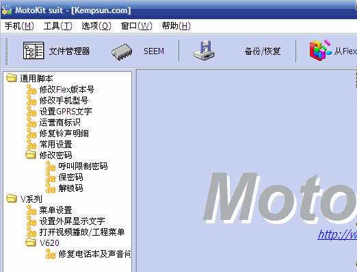 MotoKit可以修改Motorola P2k系列的手机的功能,包含文件管理器,V系列开关机画面修改,FLEX恢复,常用功能选项,菜单隐藏/显示,音量调节,开启视频,模拟键盘等修改功能。软件包包含Visual Seem和P2kman两个程序。