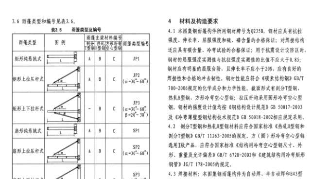 本图集与建筑标准图集《钢雨篷(一)(玻璃面板)》07J501-1配套使用。本图集将钢雨篷作为构件列表绘图,使工程设计人员可根据具体工程情况直接选用;钢雨篷与主体结构连接处的节点构造详图及预埋件可直接选用。本图集提供了钢雨篷选用表及构件内力表,图集中未涉及的其他形式钢雨篷,设计者通过对比内力,可参考选用相应构件和连接节点;若实际基本风压和基本雪压与图集中给定数值不符时,设计者可自行核算组合值后,对比图集中给定的1、2级荷载组合值,参考选用相应的雨篷。