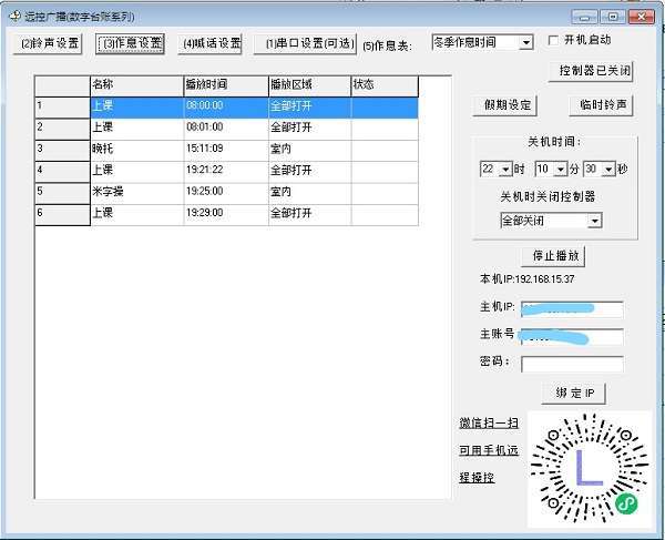 远控广播  (数字台账系列)在具备传统打铃系统的常用功能基础上,进行了功能拓展,可以进行远程喊话,远程控制铃声等功能;本软件是绿色软件,无需安装,首先解压ling.zip,运行server.exe(建议先关闭防火墙和杀毒软件,否则有可能被拦截,本软件无毒,请放心使用)