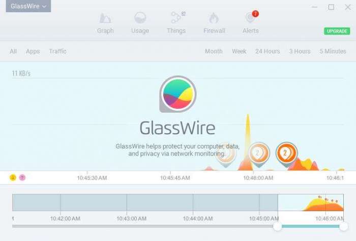 人们很容易看到 GlassWire 过去的网络活动以及详细的网络活动上的一个简单的了解曲线图。