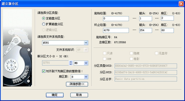 对于GUID分区表格式,还可以设置新分区的更多属性。设置完参数后点击“确定”即可按指定的参数建立分区。
