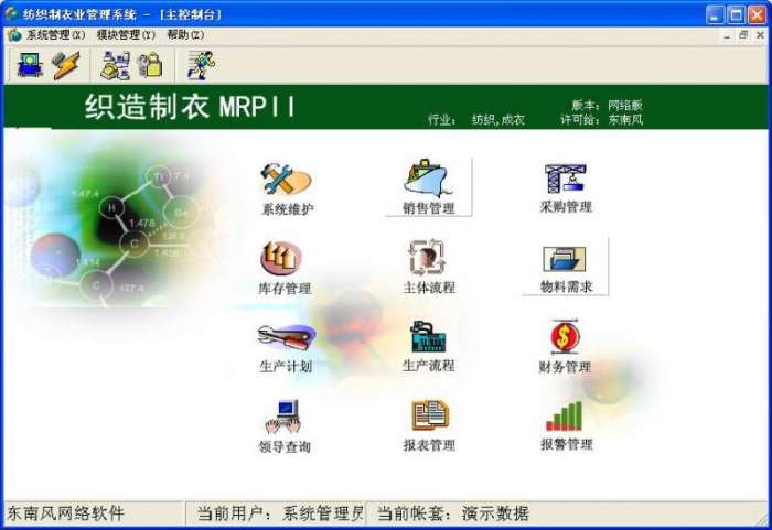 纺织制衣管理系统网络版最新版主要功能: 本系统主要模块有:系统维护,采购管理,销售管理,库存管理,主体流程,物料需求,生产计划,生产流程,外包加工、领导查询、财务管理(应收应付),人事薪资共12个模块。