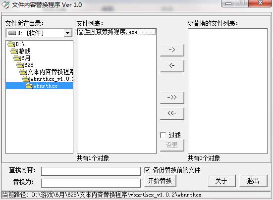 要替换许多网页或文件里的同一内容,用记事本一个个打开进行替换太累,本软件能进行批量文件内容的替换,而且是绿色软件,不需安装,过滤是对同一目录下的文件后缀进行过滤,打勾的是有效项,这样你就不会替换声音文件了,备份存在和替换的文件同一目录的bak目录下。