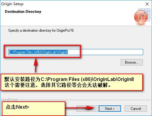 8.选择安装路径,一般都是默认路径,默认是最好的,如果选择其他地方,可能会修改失败。需记住安装路径(C:\Program Files (x86)\OriginLab\Origin8),下面修改要用到的。