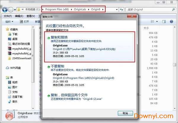 2.将“Origin8.exe”复制到软件的安装目录(C:\Program Files (x86)\OriginLab\Origin8),提示覆盖,点击“复制和替换”,即可汉化完成。