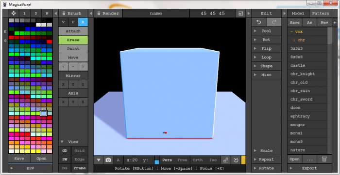 尽管MagicaVoxel没有那么令人印象深刻的时候,它的功能,它通过其显著的直观性;任何用户,甚至那些有素的编辑或其他3D建模应用程序之前没有任何经验,可以开始创建的对象吧,无需经过冗长的教程。你习惯于应用程序的基本功能后,你可以利用配置的键盘快捷键来加快创造过程和更高效地工作。