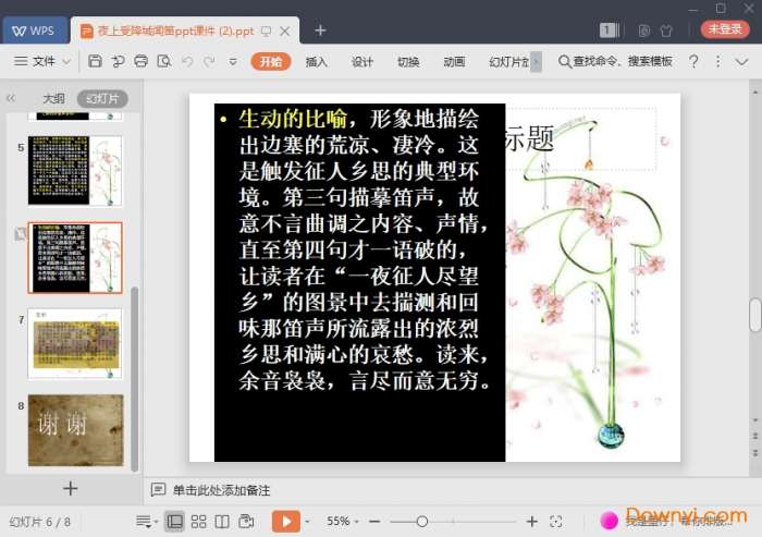 夜上受降城闻笛ppt课件 绿色版夜上受降城闻笛ppt为你提供了多种有用的使用内容,让你在学习的时候可以更好的了解其中的内容。课件中讲解这首诗从多个方面开始,一是重点字词、在是诗文含义,再者背后内容。欢迎来当易网下载!简介:《夜上受降城闻笛》是唐代诗人李益创作的一首七言绝句。这首诗