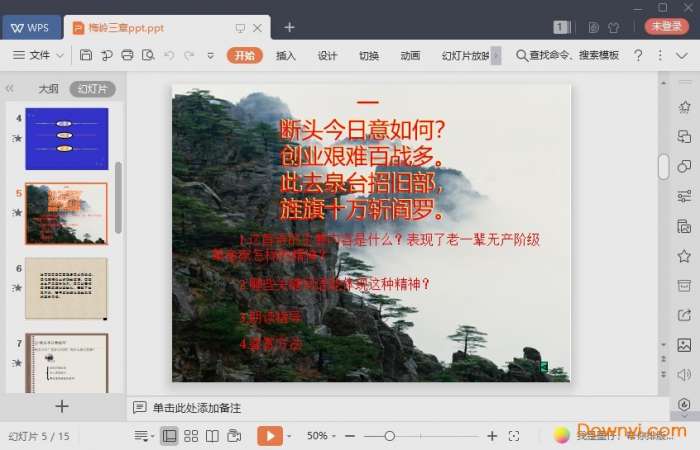 梅岭三章ppt课件通过思考来讲写这首诗的情况,让你在使用的时候可以更加方便的了解诗词所要表达的含义。其次就是通过写作背景来展示作者的决心。如果你需要欢迎来体验!