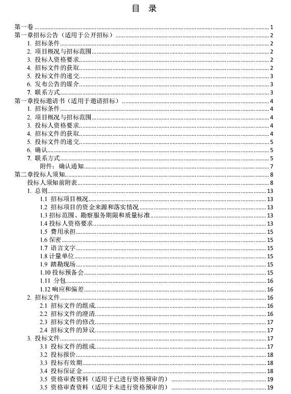 中华人民共和国标准勘察招标文件 pdf高清版中华人民共和国标准勘察招标文件是为勘察设计发布的招标文件,详细的文字说明,无论是招标还是投标需更加国家相关制度来执行,做到公平、公正,更多详情,用户可以来当易网下载了解!使用说明1、《标准勘察招标文件》适用于工程勘察招标。2、《标准勘察招标