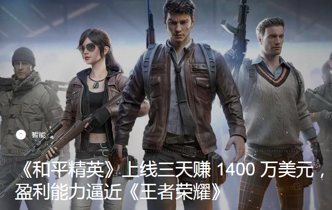 和平精英三天赚 1400 万美元你信吗?比王者荣耀还牛? 根据绝地求生改编的一款游戏上线很长时间了,在前些日子一条关于游戏公司盈利的新闻被人关注,《和平精英》正在帮腾讯挽回获得版号前提供免费服务造成的损失。 2019-10-20 新闻