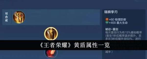 王者荣耀黄盾属性怎么样?这是这个赛季新上线的装备,那么它跟以前的黄刀有什么区别呢?接下来小编会把整理的王者荣耀黄盾属性分享在下方,有需要的小伙伴可以来参考参考。 《王者荣耀》黄盾属性一览 黄盾牌通常指的是具有破甲属性的防御