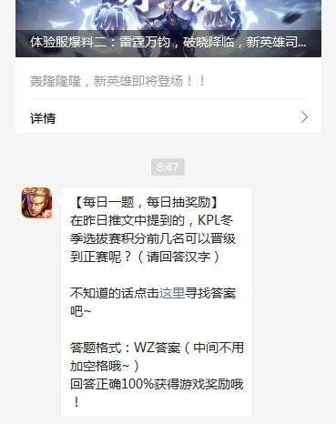 在昨日推文中提到的KPL冬季选拔赛积分前几名可以晋级到正赛呢?王者荣耀12月30日每日答案[图文]