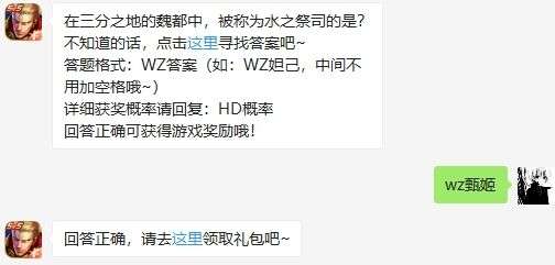 今天王者荣耀每日一答的题目是“在三分之地的魏都中,被称为水之祭司的是”下面小编为大家带来今日份答案,每日持续更新,欢迎大家继续关注我们! 2020年王者荣耀7月4日微信每日一题问题 在三分之地的魏都中,被称为水之祭司的是? 不知道的话