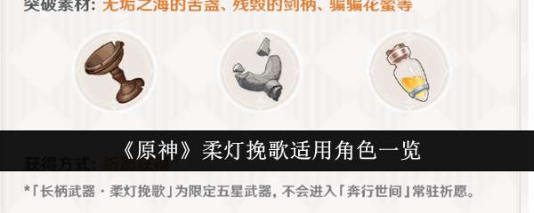 原神柔灯挽歌可以给谁用?柔灯挽歌是调香师艾梅莉埃的专属武器,除了调香师之外还有其他的角色也可以使用这个武器。下面为大家介绍一下柔灯挽歌的武器属性以及可以使用这个武器的角色,玩家们可以参考以下的攻略来进行搭配。 《原神》柔灯挽歌适