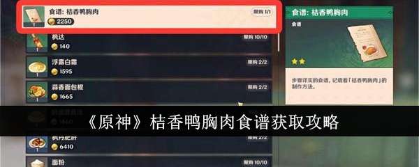 原神桔香鸭胸肉食谱怎么获取?在游戏新版本中推出了全新的食谱可供玩家进行获得,其中桔香鸭胸肉是一道二星食物,小编已经帮助玩家们整理好了桔香鸭胸肉这道菜的详细信息,一起来了解一下吧。 《原神》桔香鸭胸肉食谱获取攻略 1、首先打