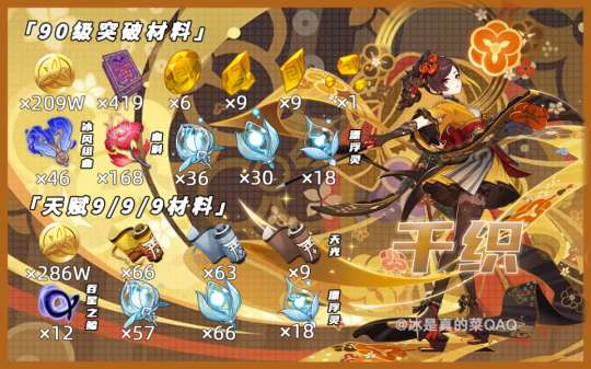 《原神》千织升级材料有哪些?千织武器升级材料有哪些?,为方便大家做了一张图,下图为千织90级天赋9/9/9材料!角色突破材料为稻妻的血斛、飘浮灵46个材料