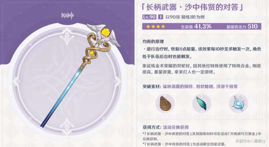 《原神》沙中伟贤的对答武器如何?沙中伟贤的对答适合给谁用?,沙中伟贤的对答这武器是治疗向,样式——双蛇双翼之杖这个进行治疗,不知道是不是限定角色自身有治疗技能才
